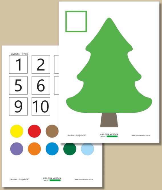 Dziecko układa na choince tyle bombek, ile wskazuje liczba na karcie. Może użyć wyciętych elementów lub zastąpić je np. pomponami, ciastoliną, naklejkami lub innymi kreatywnymi materiałami. Ćwiczenie można dostosować do poziomu dziecka — zaczynając od liczb 1–3, przez 1–5 i stopniowo rozszerzając zakres do 10.