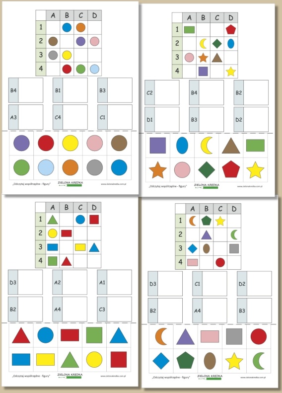 Na początku dziecko wycina figury geometryczne z dolnej części strony. Następnie analizuje siatkę (tabelę) oznaczoną literami (A–D) i cyframi (1–4), która znajduje się na górze karty pracy. Pod siatką znajdują się współrzędne, np. B1, a obok nich puste pola. Zadaniem dziecka jest odczytać współrzędną, sprawdzić, jaka figura znajduje się w danym miejscu kratownicy, a następnie wkleić wycięty wcześniej obrazek w odpowiednie pole.