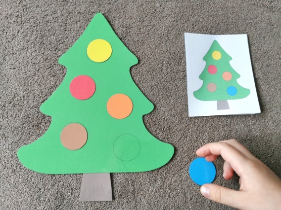 Dziecko otrzymuje kartę ze wzorem, który pokazuje rozmieszczenie kolorowych bombek na choince. Następnie odwzorowuje ten układ, układając bombki na przygotowanej ilustracji. Aby zwiększyć trwałość i możliwość wielokrotnego użycia, można wydrukowane elementy zalaminować, a bombki przyczepiać na rzepy do choinki. Zabawa rozwija spostrzegawczość, precyzję i koncentrację, a dodatkowo wprowadza w radosny, świąteczny klimat.