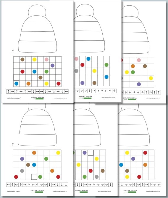 Zadanie polega na śledzeniu trasy wyznaczonej przez strzałki na siatce i zapamiętywaniu pojawiających się po drodze kolorów. Następnie dziecko wykorzystuje te kolory do pokolorowania czapki w takiej samej kolejności. To ćwiczenie rozwija kodowanie wzrokowe i koncentrację.